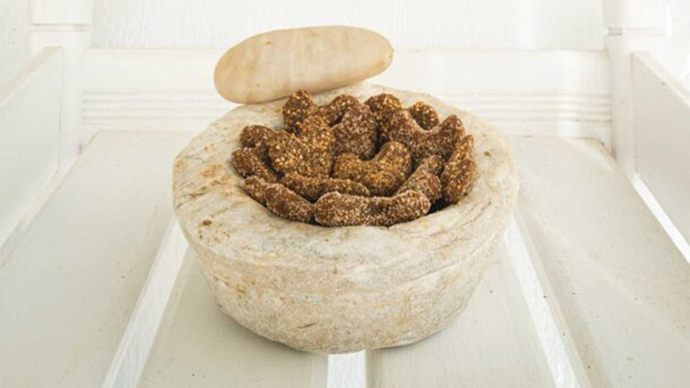 - Για την κοπανιά, ξεκινάμε και σε μεγάλο γουδί (ή στον πολυκόφτη), θρυμματίζουμε τα παξιμάδια, μέχρι να γίνουν σαν χοντρά ψίχουλα.