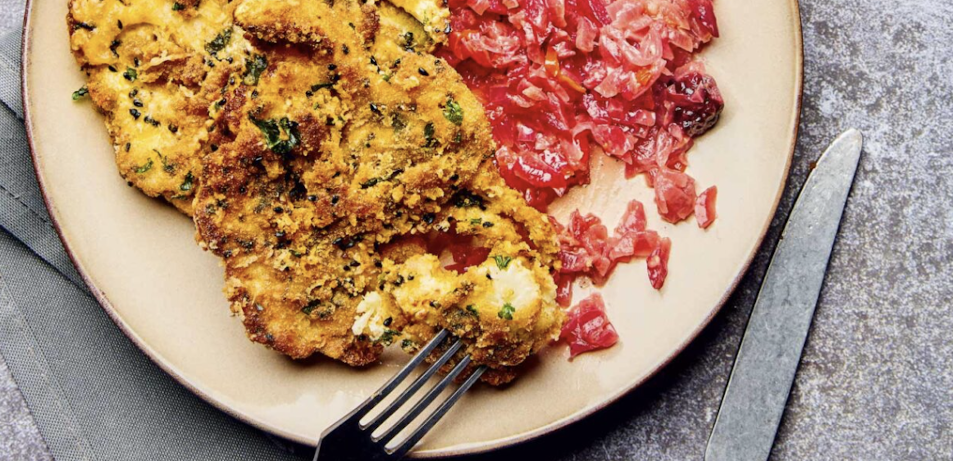 Το κουνουπίδι όπως δεν το έχετε ξαναφάει. Θα το λατρέψουν ακόμα και οι φανατικοί αρνητές του. Τραγανό πανάρισμα με παρμεζάνα, σουσάμι και μαυροκούκι και οι φέτες κουνουπιδιού γίνονται ονειρεμένες σαν «σνίτσελ». Ιδανικό συνοδευτικό του, μια ζεστή λαχανοσαλάτα ή ένας αφράτος πουρές πατάτας.