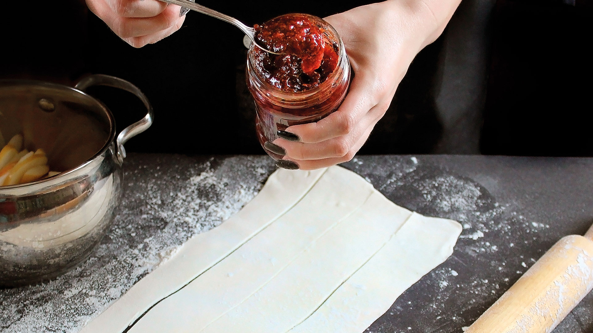 - Απλώνουμε σε κάθε λωρίδα μία στρώση μαρμελάδα φράουλα.
