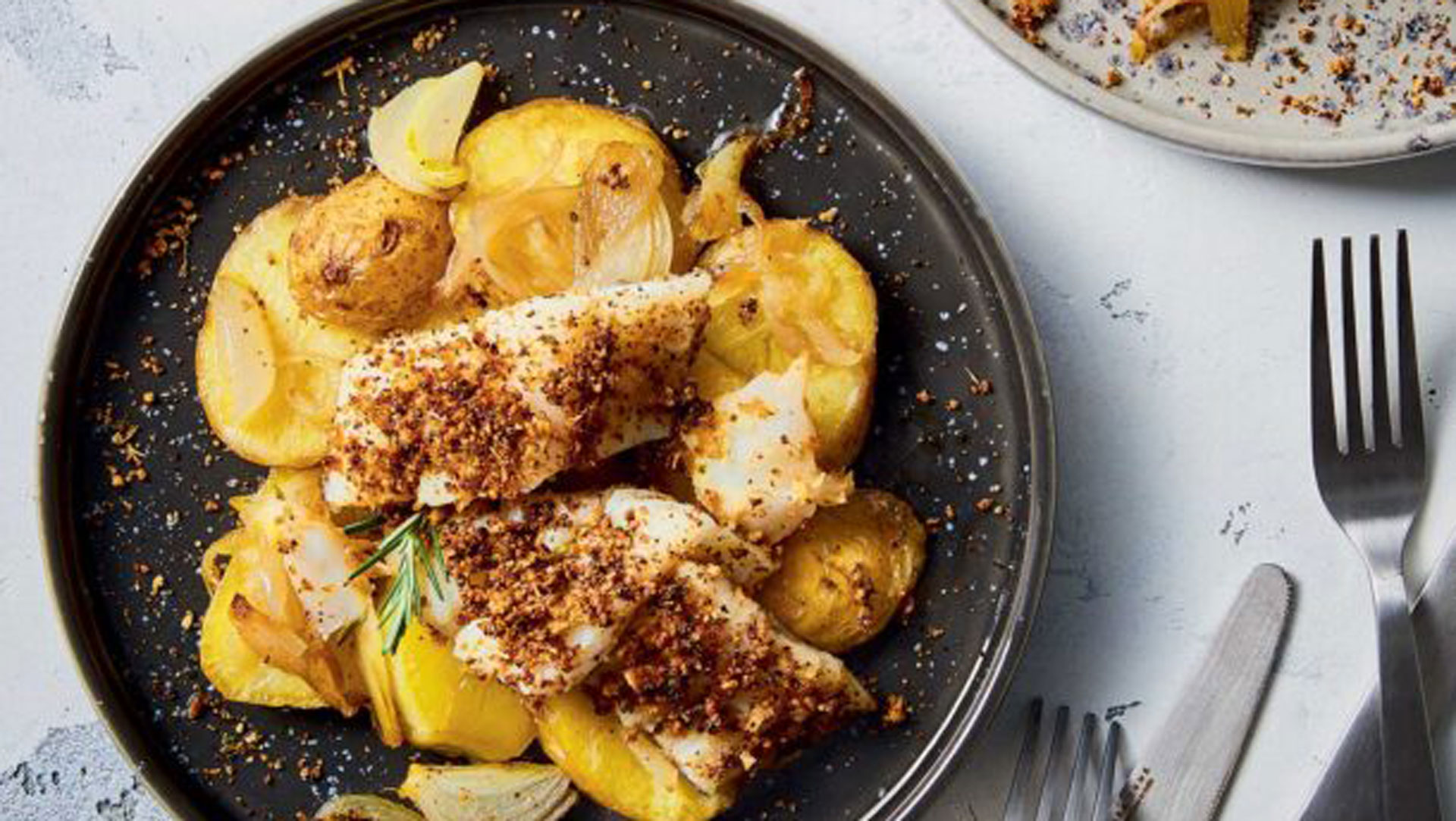 Μπακαλιάρος πορτογαλικός, με πατάτες, κρεμμύδια και σκορδάτη κρούστα