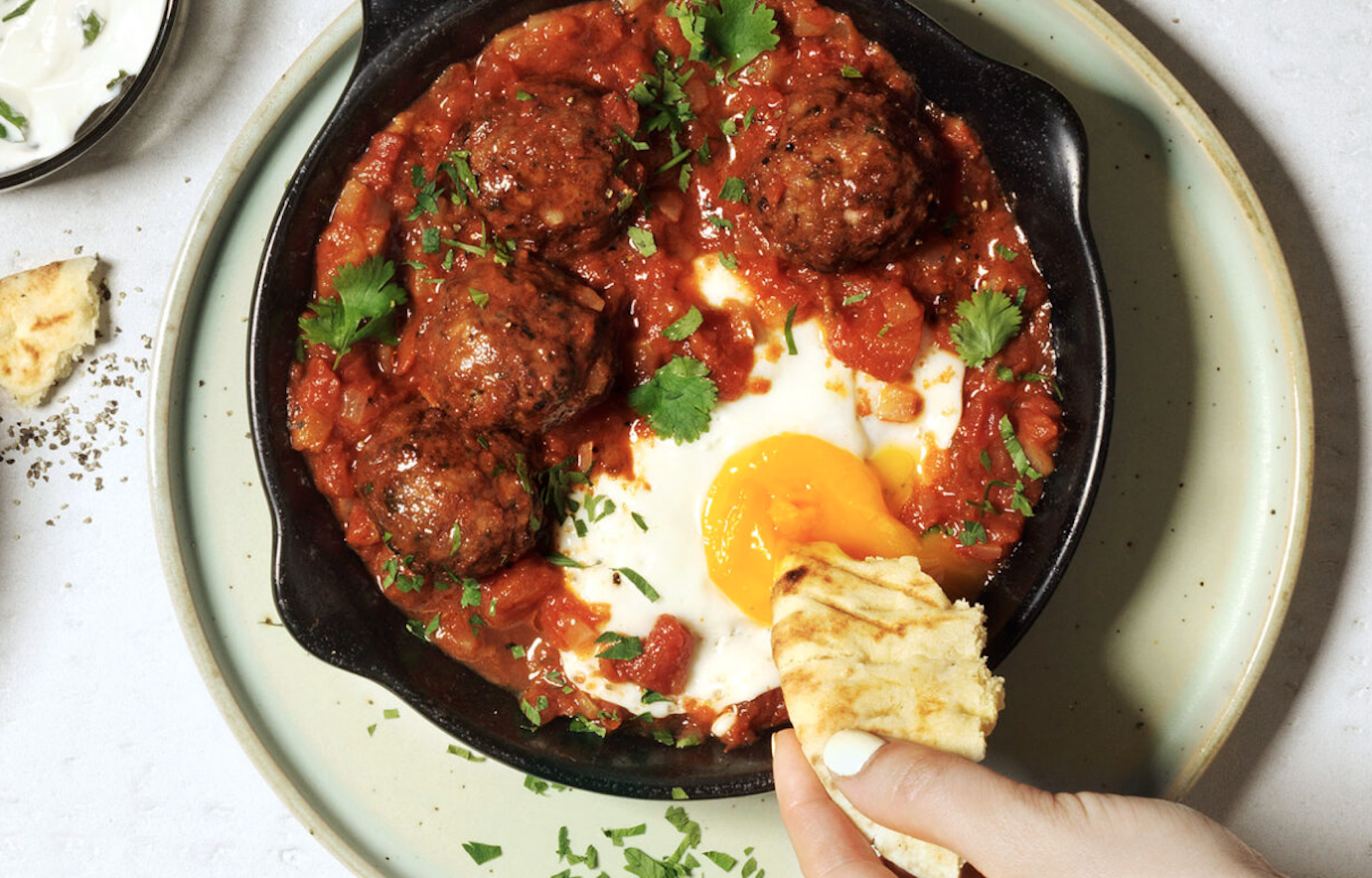 Ένα πιάτο ζουμερό, χορταστικό και πληθωρικό με αρνίσια κεφτεδάκια και αυγά λουσμένα σε πικάντικη σάλτσα ντομάτας.