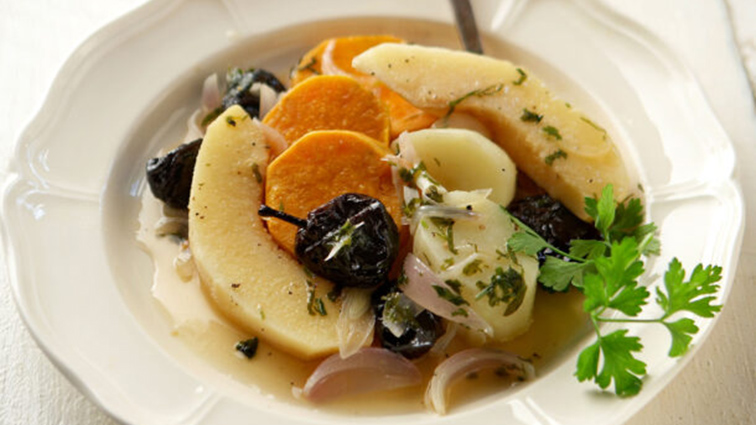 - Κόβουμε και όλες τις πατάτες σε κομμάτια, το κρεμμύδι σε φέτες και τα βάζουμε όλα μαζί στην κατσαρόλα με το λάδι, το μαϊντανό, αλατοπίπερο και το γλυκάνισο.