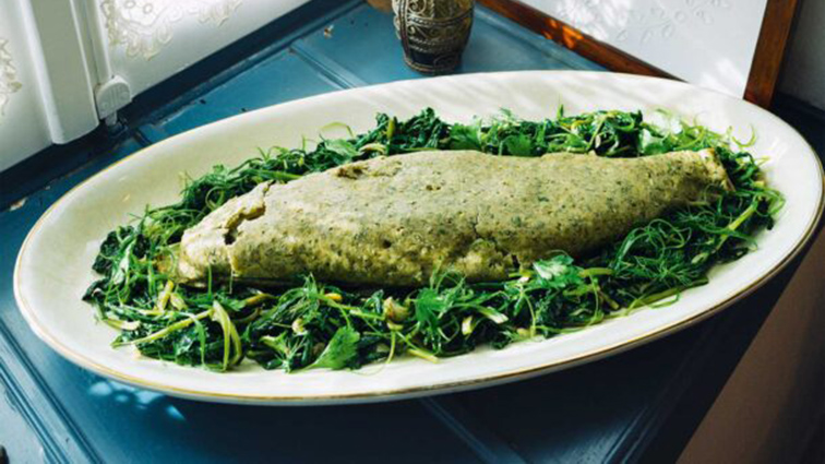 - Για να σερβίρουμε, σπάμε τη ζύμη και αποκαλύπτουμε τη ζουμερή και αρωματισμένη πέστροφα.