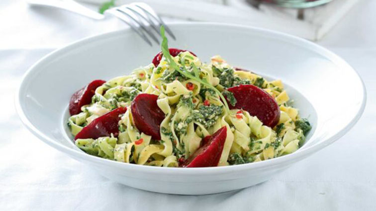 - Για να φτιάξουμε τη μακαρονάδα με παντζάρια, ξεκινάμε και ζεματίζουμε τη ρόκα σε βραστό νερό, την κρυώνουμε και τη στεγνώνουμε.