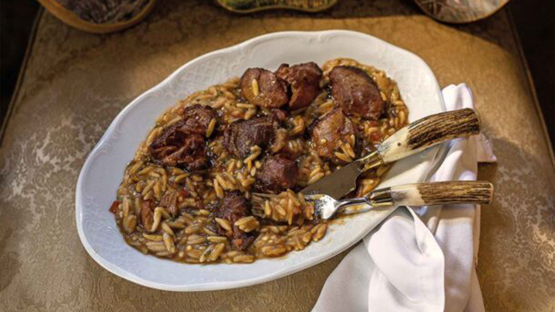 Στο οδοιπορικό του «Γαστρονόμου» στην Πίνδο συναντήσαμε τον σεφ Θανάση Τάσσο. Στο Μπουραζάνι της Κόνιτσας, σε μια κοιλάδα ανάμεσα στα θηριώδη βουνά του Γράμμου, της Τύμφης και της συνοριακής Νεμέρτσικα. Ο σεφ, στη μεγάλη τραπεζαρία του ξενοδοχείου Bourazani Resort, που είναι στολισμένη με πίνακες με θέμα το κυνήγι, έστρωσε ένα πλούσιο τραπέζι με θηράματα της περιοχής. Ανάμεσα σε άλλα μας έφτιαξε και αυτό το πεντανόστιμο γιουβέτσι με αγριογούρουνο. Είναι μεγαλωμένος με αυτή τη συνταγή κρασάτου αγριογούρουνου, αφού από μικρός το έτρωγε από τον παλιό μάγειρα του ξενώνα στο Μπουραζάνι. Την έχει προσαρμόσει στα μέτρα του, ενσωματώνοντας απλές αλλά ουσιαστικές τεχνικές, όπως το καψάλισμα των οστών στον φούρνο για να κάνει έναν ζωμό με βάθος γεύσης. Προσθέτει επίσης παρμεζάνα και βούτυρο για το χύλωμα στο κριθαράκι, εμπνεόμενος φυσικά από την τεχνική του ριζότο.
