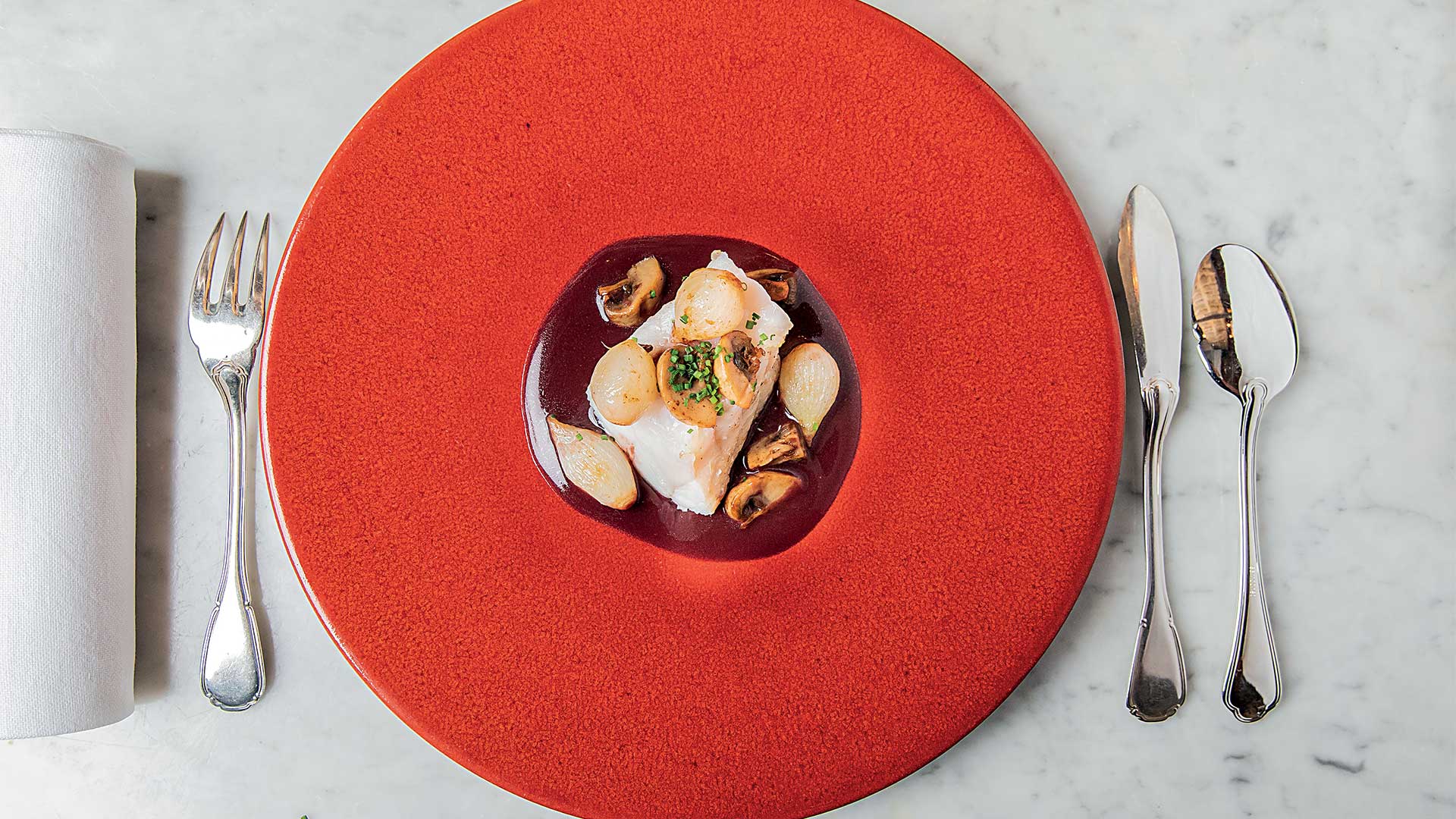 Μη σας φοβίζει το σερβίρισμα αυτού του πιάτου. Ο executive chef της Σπονδής Arnaud Bignon μάς δίνει μια ιδέα για να στήσουμε διαφορετικά μια σχετικά απλή συνταγή με ψάρι και σάλτσα. Βάζουμε στη βάση του πιάτου τη σάλτσα και πάνω το ψάρι και τα συνοδευτικά. Προτιμήστε να μη φορτώσετε με πολλά υλικά το πιάτο για πιο φινετσάτο αποτέλεσμα.