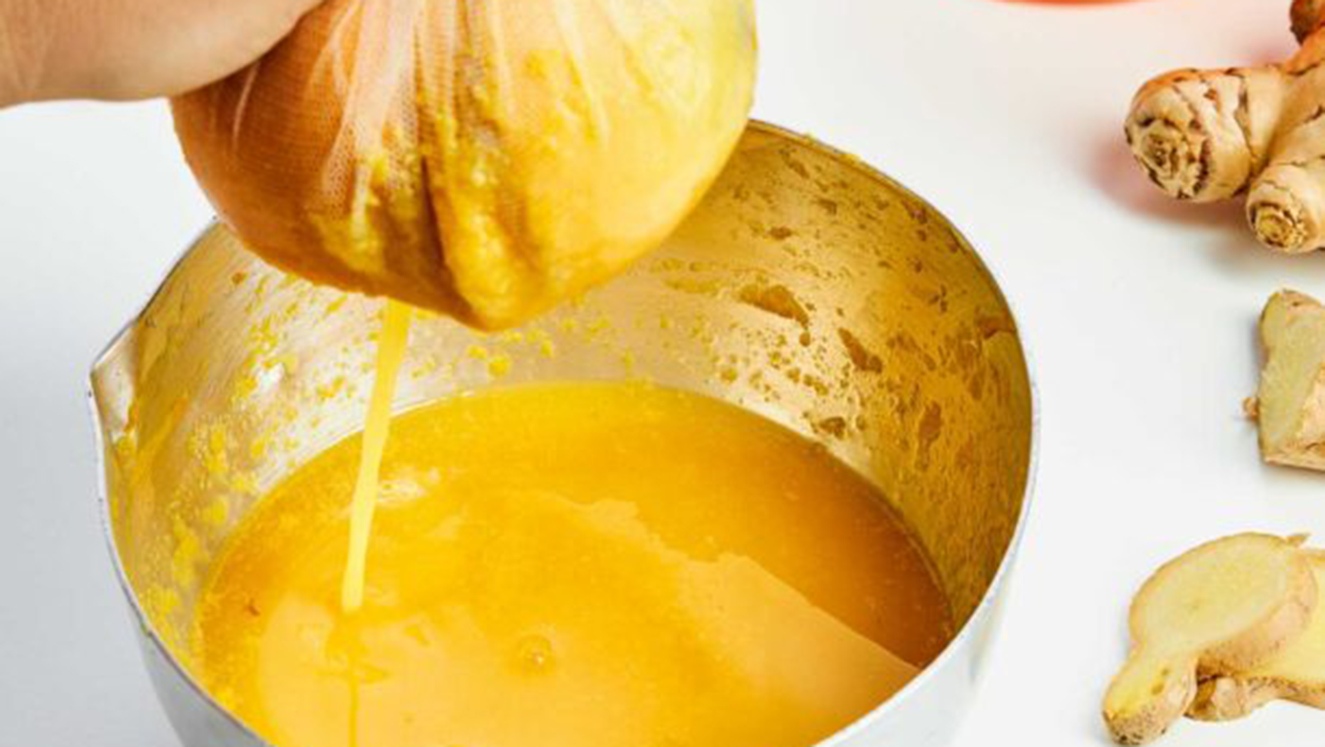 - Μεταφέρουμε όλο το περιεχόμενο της γυάλας (μαζί με το τουλπάνι που περιέχει τις κούπες) σε μια κατσαρόλα, προσθέτουμε το τζίντζερ και βράζουμε για περίπου 45 λεπτά, σε μέτρια προς δυνατή φωτιά, ανακατεύοντας τακτικά.