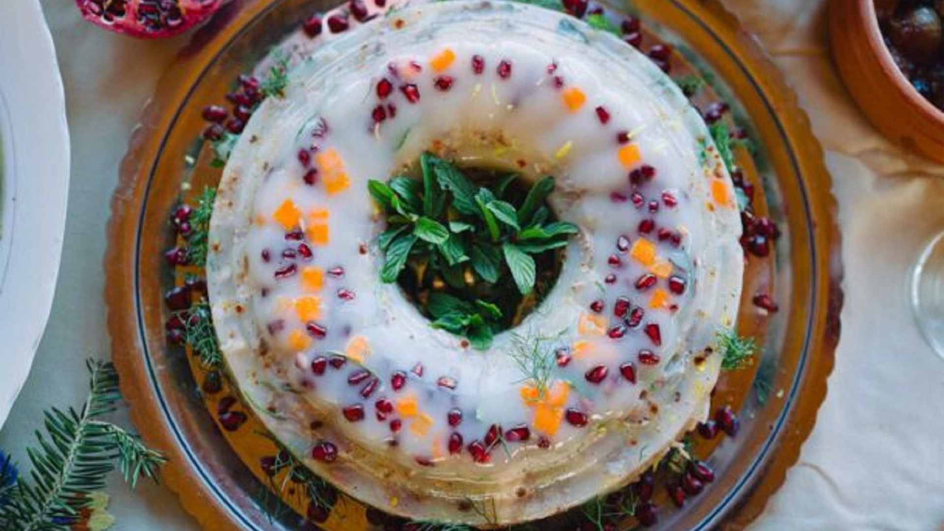 Με ένα μυρωδάτο μπουκέτο από βότανα και εσπεριδοειδή αρωματίζουμε και στολίζουμε αυτή τη γιορτινή πηχτή. Εχει τον κόπο της αλλά θα ενθουσιάσει τους λάτρεις του είδους.