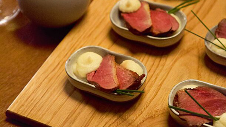 - Σερβίρουμε τις φέτες ψητής πάπιας με τον πουρέ και τη σάλτσα σε μπολάκι.