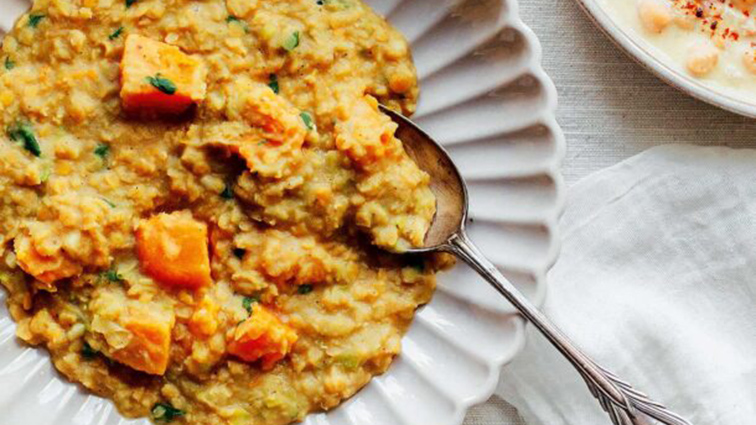 - Πασπαλίζουμε με τον κόλιανδρο και σερβίρουμε τις κόκκινες φακές με πράσο και κολοκύθα.