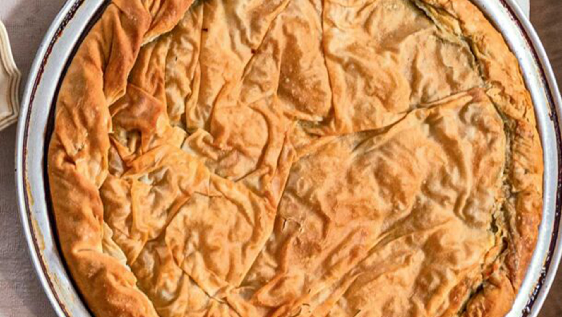 - Λαδώνουμε το ταψί και στρώνουμε εκεί το φύλλο, ελαφρά τσαλακωμένο και με τις άκρες του να εξέχουν αρκετά από το σκεύος.