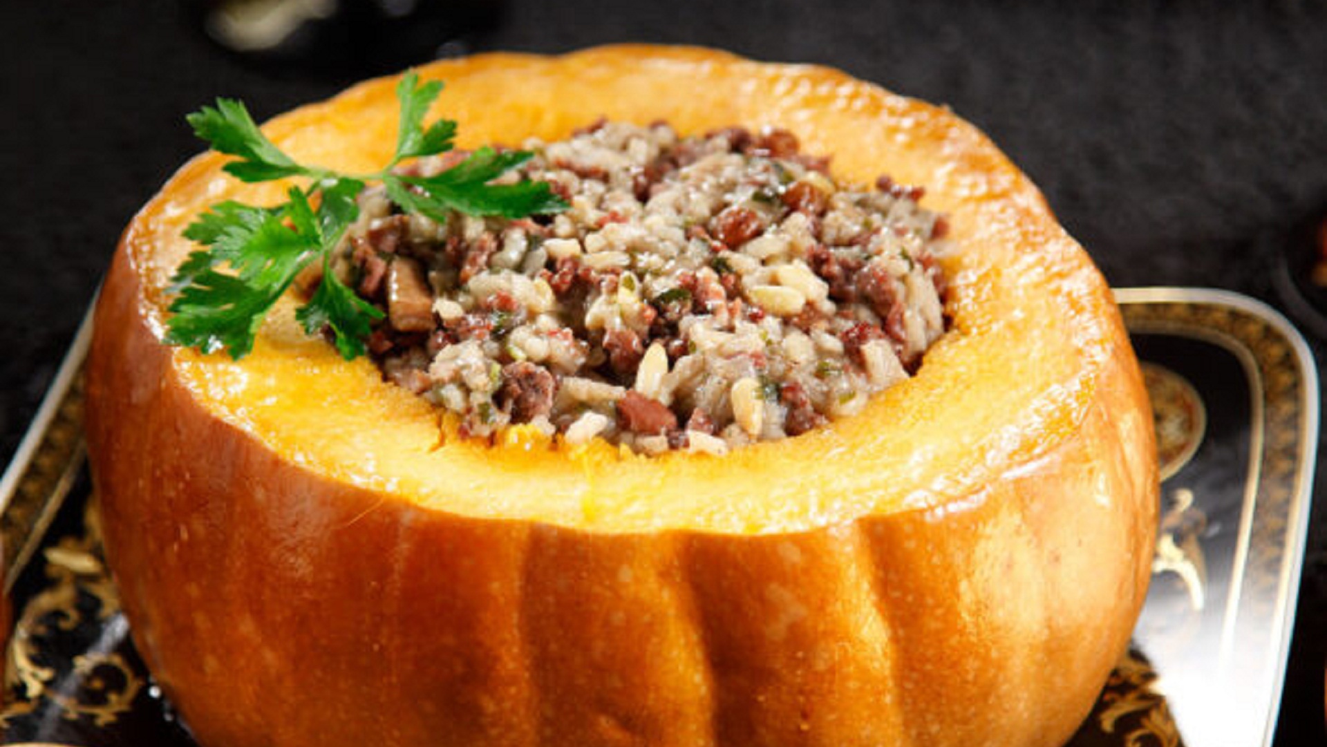 Φτιάχνουμε Calabaza rellena, δηλαδή κολοκύθα γεμιστή με μοσχαρίσιο κιμά, ρύζι, σταφίδες, κουκουνάρια και μπέικον. Οι καλεσμένοι σας θα εντυπωσιαστούν!