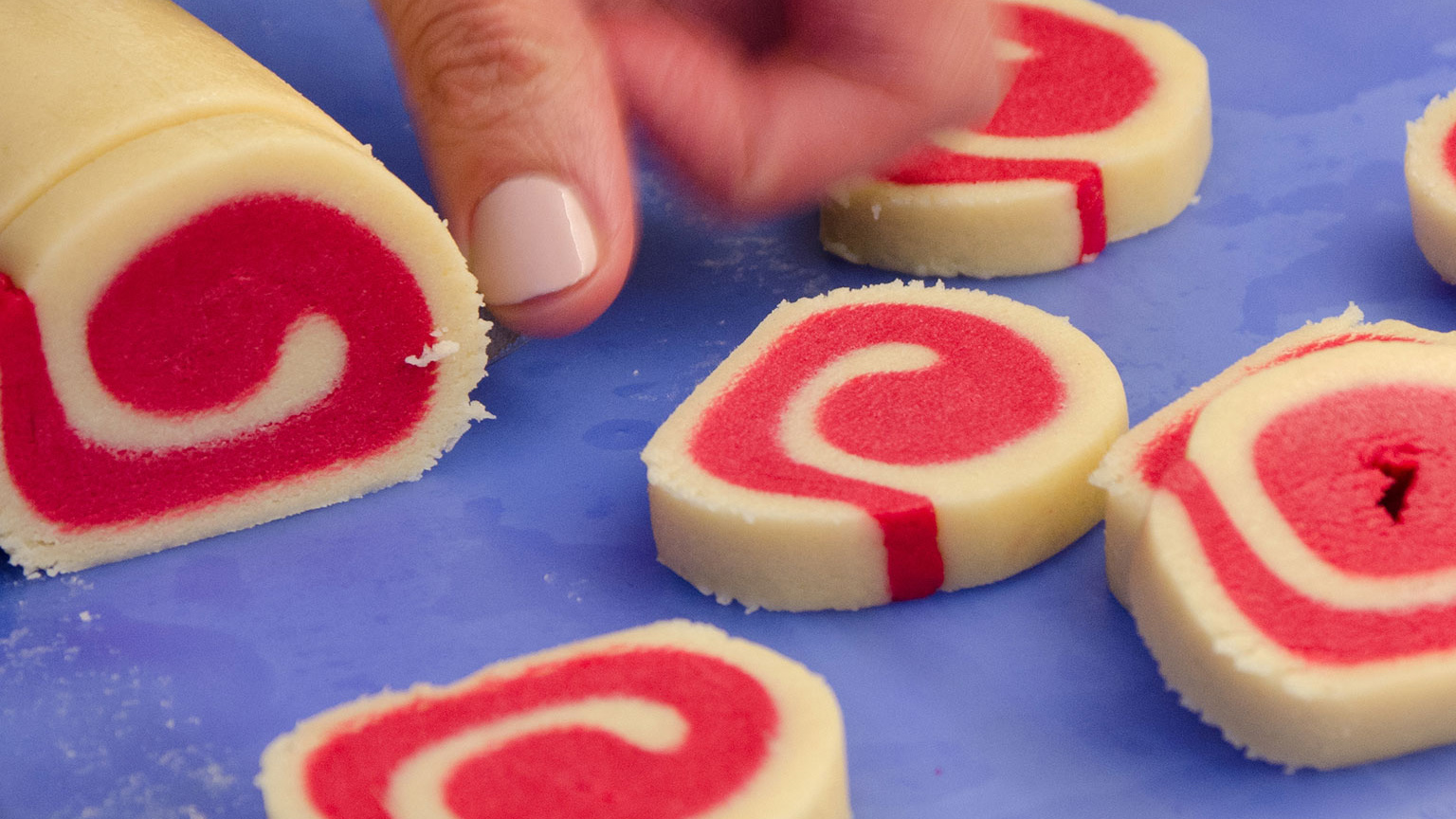 Δύο χρώματα στη ζύμη, κόκκινο και μπεζ, τύλιγμα, κόψιμο σε ροδέλες, μερικά sprinkles, ένα πέρασμα από τον φούρνο και… έτοιμα τα χρωματιστά μπισκότα. Βάλτε και τα παιδιά να βοηθήσουν, θα το χαρούν.