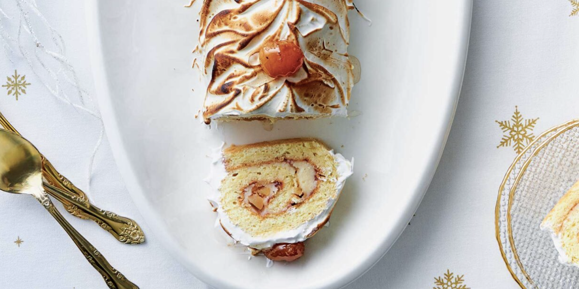 - Βγάζουμε το ρολό από το ψυγείο και αφαιρούμε τη λαδόκολλα. Το αλείφουμε όλο με τη μαρέγκα με ένα μαχαίρι, σχηματίζοντας ακανόνιστες κορφές. Αν θέλουμε, τις καψαλίζουμε ελαφρώς με ένα φλόγιστρο.