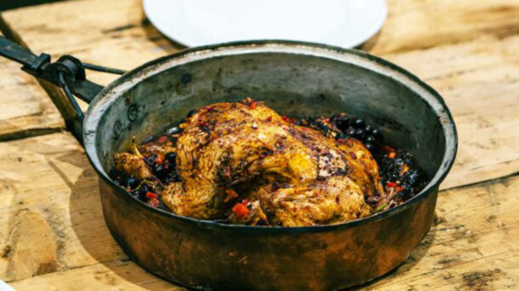 - Περιχύνουμε την όρνιθα με τη σάλτσα της σαλτσιέρας, ραντίζουμε με λίγο αγουρέλαιο και σκορπίζουμε τους σπόρους ροδιού. Σερβίρουμε αμέσως.