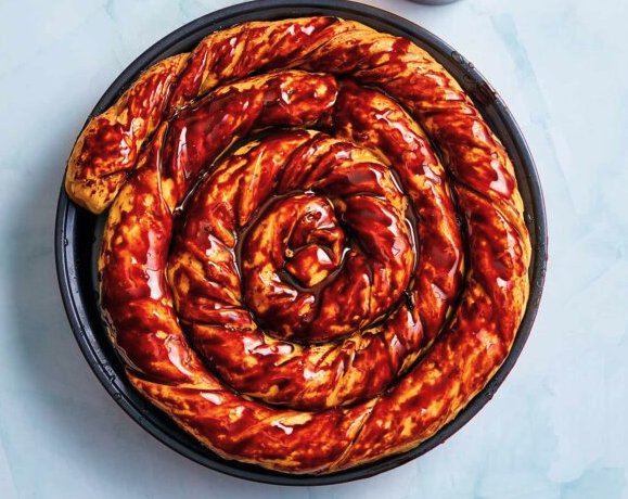 - Συνεχίζουμε ανοίγοντας σε φύλλο ένα ένα και τα υπόλοιπα κομμάτια ζύμης, τα οποία τυλίγουμε σε ρολά και τακτοποιούμε εφαρμοστά γύρω από τον σαλίγκαρο του ταψιού, ώστε στο τέλος να σχηματιστεί ένας μεγάλος σαλίγκαρος που να πιάνει όλο το ταψί.