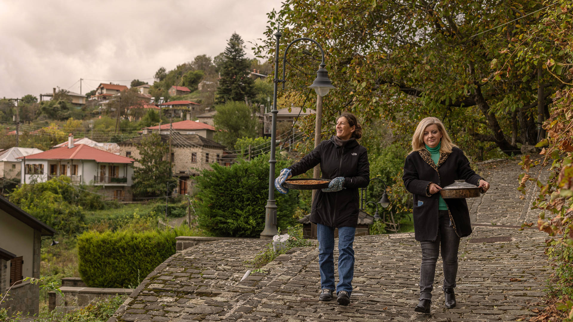 Η Βασιλική με τον άντρα της Κώστα είναι δύο από τους μόλις 30 μόνιμους κατοίκους του χωριού. Είναι γνωστή στα Ζαγοροχώρια για τις πίτες της και τα μαθήματα για το άνοιγμα φύλλου που παραδίδει στα εργαστήρια του καλοκαιρινού Φεστιβάλ Βοβούσας, ενώ μαγειρεύει και στη μοναδική ταβέρνα-καφενείο του χωριού. Μας υποδέχτηκε πανέτοιμη να μας δείξει πώς ετοιμάζεται η πρωτοχρονιάτικη βλαχόπιτα με τα δεκαπέντε φύλλα και το άφθονο βούτυρο και μας ξενάγησε όχι μόνο στα καλντερίμια, στα γεφύρια και στα περάσματα με τρεχούμενα νερά του χωριού, αλλά και στα μυστικά της χειμωνιάτικης και γιορτινής κουζίνας του.