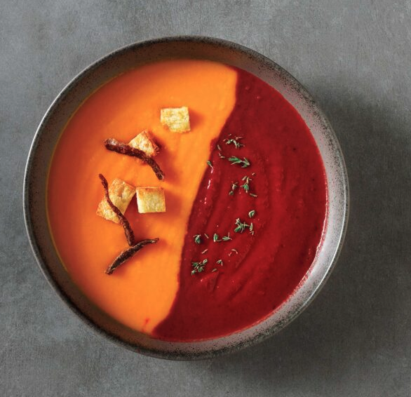 Η ιδέα είναι η εξής: φτιάχνουμε δύο από τις σούπες που μας προτείνει η Νένα Ισμυρνόγλου και τις συνδυάζουμε μαζί στο πιάτο.Φυσικά μπορούμε να απολαύσουμε και την κάθε μια μόνη της ξεχωριστά. Σημειωτέον ότι τα χρώματα είναι απολύτως φυσικά και προκύπτουν από τα λαχανικά και τα υπόλοιπα υλικά κάθε συνταγής.