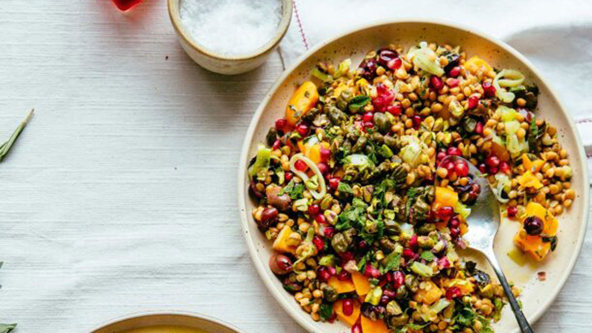 Οι φακές μεταμορφώνονται σε ένα ιδιαίτερο, πρωτότυπο και εντυπωσιακό λαδερό με την προσθήκη φουρνιστής κολοκύθας, άφθονων μυρωδικών, σπιρτόζας κάππαρης και γιορτινών σπόρων ροδιού.