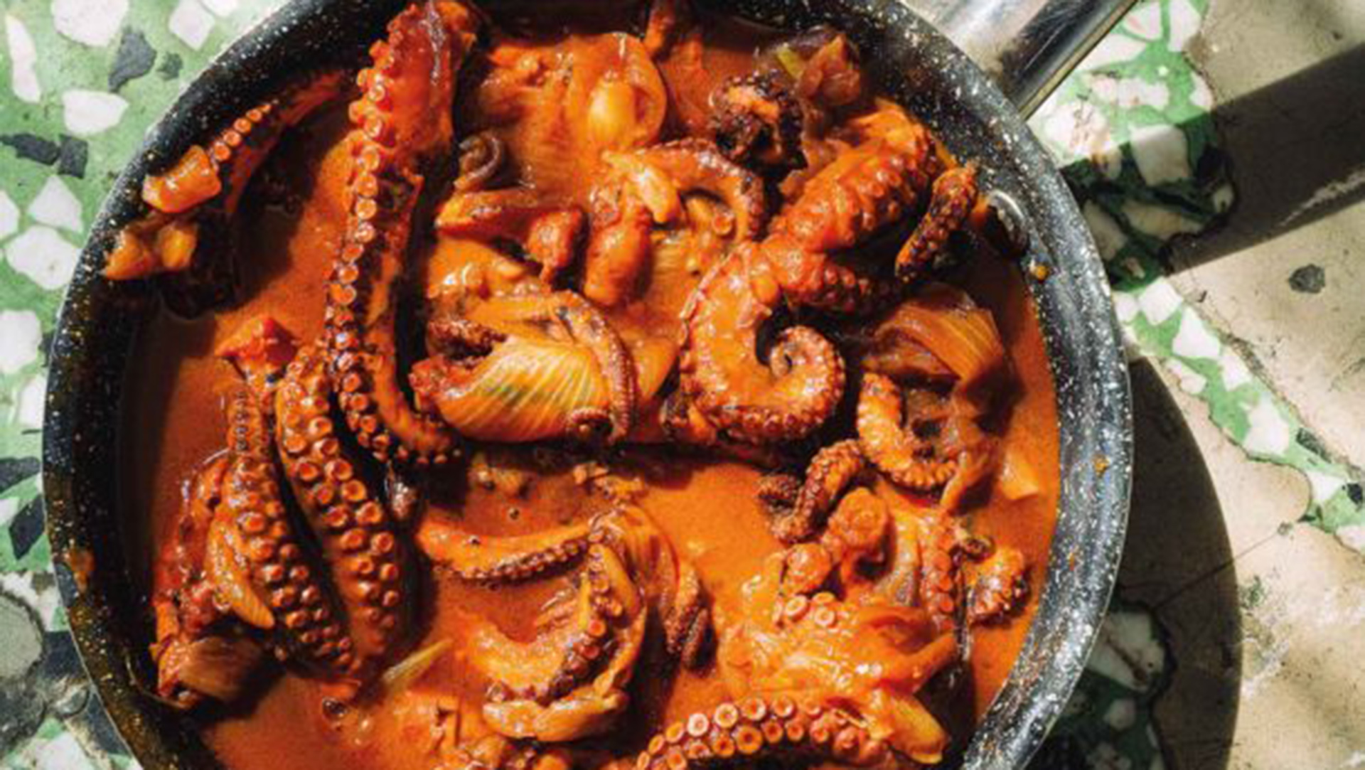 Από τις πιο νόστιμες συνταγές για χταπόδι! Θα πρέπει όμως να καθαρίσουμε καλά το χταπόδι ως εξής: Με ένα κοφτερό μαχαίρι αποκόβουμε την κουκούλα από τα πλοκάμια και την καθαρίζουμε από τα εντόσθια. Αφαιρούμε από το εσωτερικό της το «δόντι», το σκληρό σημείο στη συμβολή των πλοκαμιών, και ψιλοκόβουμε την κουκούλα. Πλένουμε πολύ καλά τα πλοκάμια, επιμένοντας στις βεντούζες, που συγκεντρώνουν άμμο, και τα κόβουμε σε μεγάλα κομμάτια (αν τα χταπόδια είναι μικρότερα, αφήνουμε τα πλοκάμια ολόκληρα).