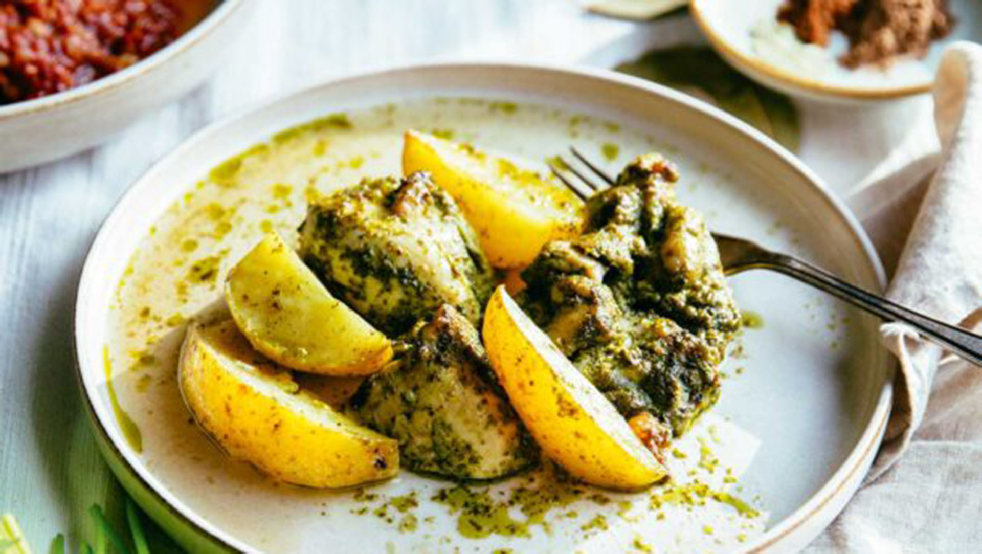 Στον πολυκόφτη που διαθέτουμε χτυπάμε τα μυρωδικά με το ελαιόλαδο, τη μουστάρδα και το σκόρδο μέχρι να σχηματιστεί μια λεία σάλτσα.