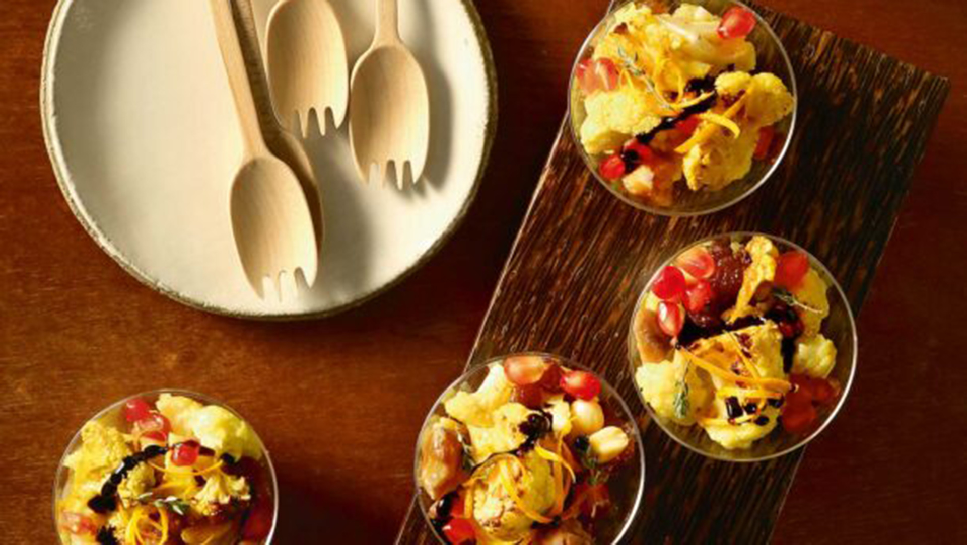 - Βάζουμε το κουνουπίδι σε μεγάλη σαλατιέρα και σκορπίζουμε το ξύσμα, τα κάστανα, τις σταφίδες, το ρόδι και τα αμύγδαλα.