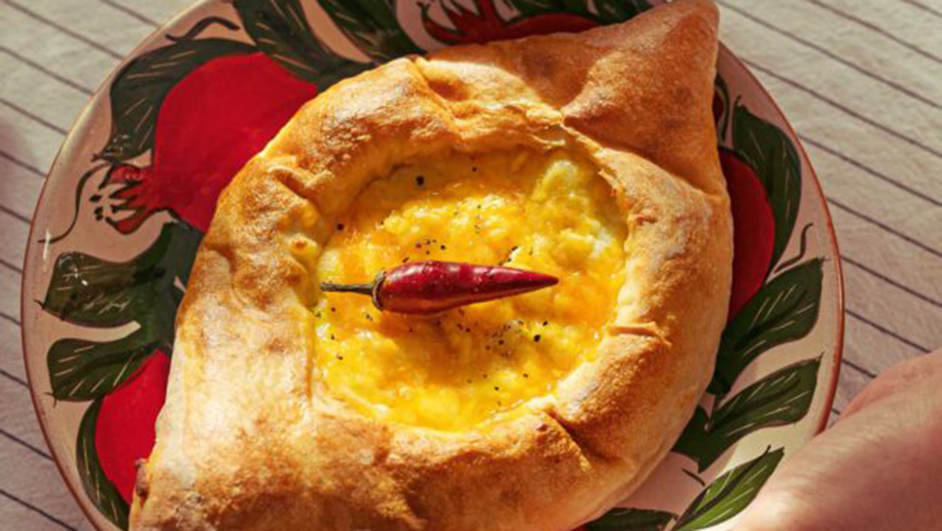 - Για να φτιάξουμε adjaruli khachapuri – το γεωργιανό χατσαπούρι, αλλά με ελληνικά τυριά, αρχικά ανακατεύουμε καλά, σε ένα μπολάκι, με ένα πιρούνι 300 ml ζεστό νερό (όχι καυτό), τη μαγιά και τη ζάχαρη.