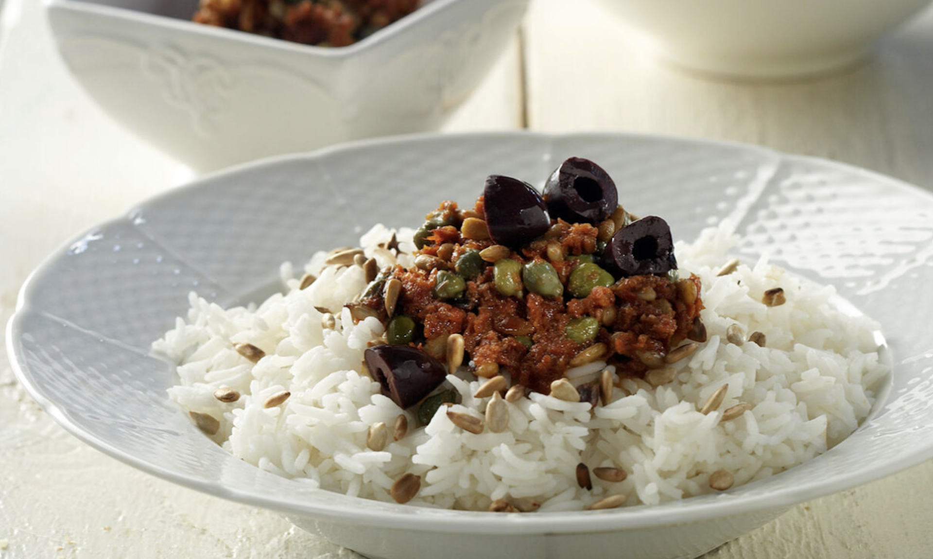 - Σερβίρουμε το ρύζι σε πιατέλα ή στα πιάτα, βάζουμε τη σάλτσα στο κέντρο και σκορπίζουμε πάνω τους σπόρους και τις ελιές. Συνοδεύεται ιδανικά με μια πράσινη δροσερή σαλάτα.