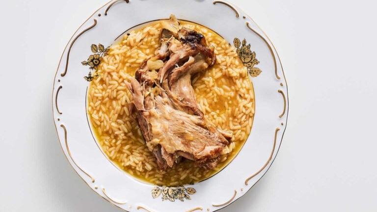 - Αδειάζουμε το πιλάφι σε μεγάλη πιατέλα και από πάνω τακτοποιούμε το κατσικάκι.