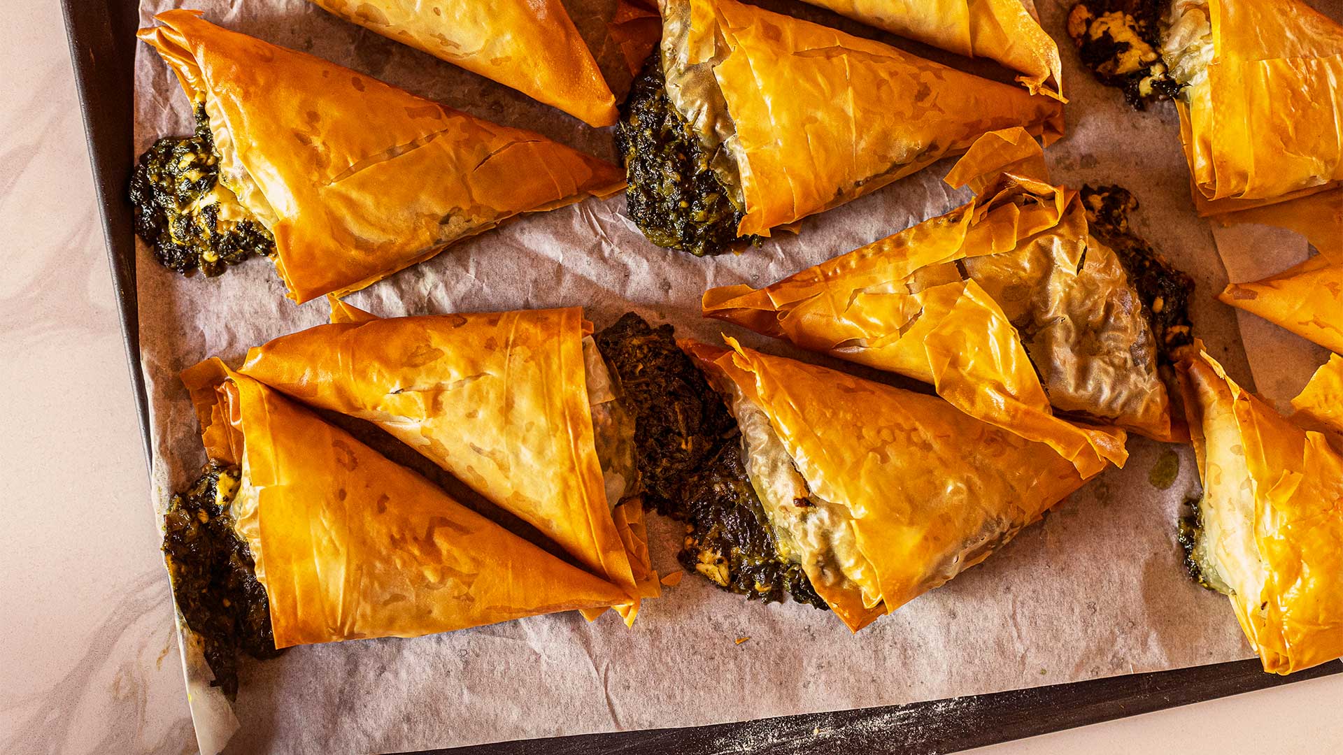 - Βάζουμε 1 γεμάτη κουτ. σούπας γέμιση στη μία άκρη και διπλώνουμε το φύλλο εναλλάξ δεξιά-αριστερά για να πάρει το πιτάκι τριγωνικό σχήμα.