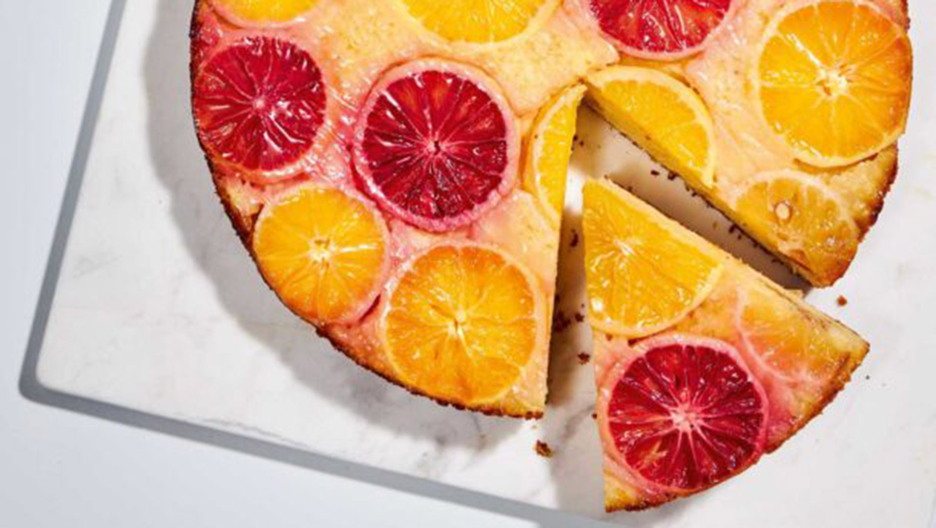- Το βγάζουμε από το σκεύος, ανασηκώνοντάς το από τις άκρες του χαρτιού που εξέχουν και το αναποδογυρίζουμε προσεκτικά σε πιατέλα, ώστε οι σιροπιασμένες φέτες των εσπεριδοειδών να βρεθούν στην επιφάνεια.