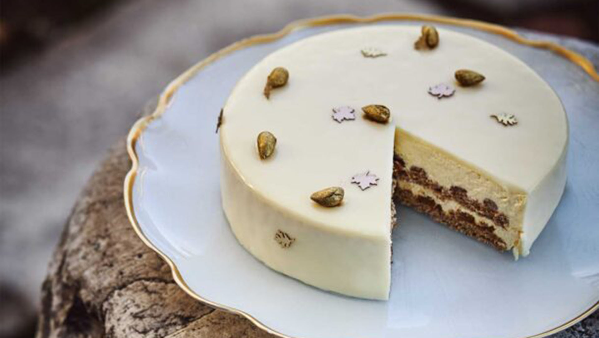 - Βγάζουμε την τούρτα από την κατάψυξη, την τοποθετούμε πάνω σε μια σχάρα και αφαιρούμε το αλουμινόχαρτο και το τσέρκι (για να γλιστρήσει εύκολα, το ζεσταίνουμε πρώτα με φλόγιστρο ή με πιστολάκι μαλλιών).