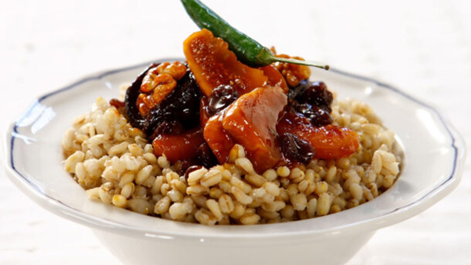- Σερβίρουμε το κριθάρι και από πάνω τη σάλτσα με τα λιαστά φρούτα.