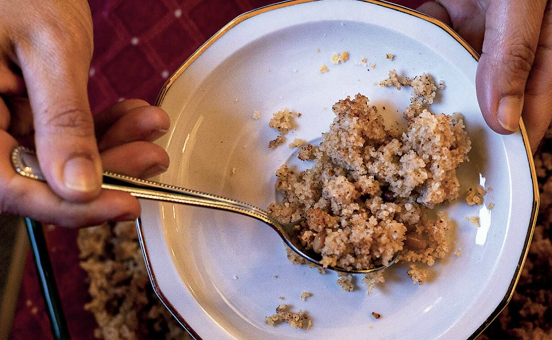 - Τον απλώνουμε σε πυρέξ και όταν κρυώσει κάπως, τον ξύνουμε με δύο πιρούνια για να γίνει σπυρωτός.