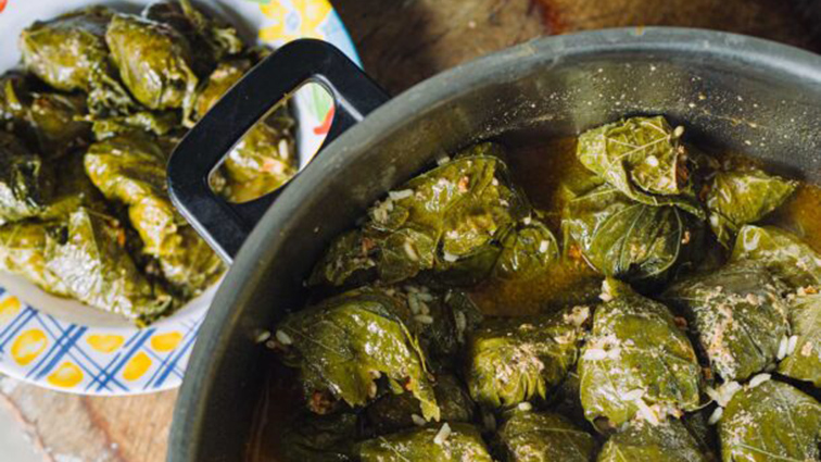 Τρία αδέφια καϊκτσίδες από το νησί μας την έδωσαν αυτή την συνταγή. Χρειάζεται λίγη εξάσκηση για να πετύχουμε ένα ωραίο πεντάγωνο, αλλά, αν δεν τα καταφέρνουμε, απλώς τα τυλίγουμε με τον κλασικό τρόπο, σε ρολό. Τα ντολμαδάκια μπαίνουν στην κατσαρόλα σε στρώσεις, με τις διπλωμένες άκρες προς τα κάτω. Στη γέμιση έχουν ρύζι και κιμά, χοιρινό συνήθως. Στην Κάλυμνο, για να δώσουν ακόμα πιο πλούσια γεύση, στρώνουν στην κατσαρόλα φέτες από λεπτά χοιρινά μπριζολάκια λαιμού ή, όπως εδώ, πανσέτα χοιρινή, που παράλληλα προστατεύουν τα «φύλλα» για να μην κολλήσουν στον πάτο. Το φαγητό αυτό μπορεί να γίνει και αυγοκομμένο, αλλά θα πρέπει να αυξήσουμε τη δόση των υγρών στην κατσαρόλα.