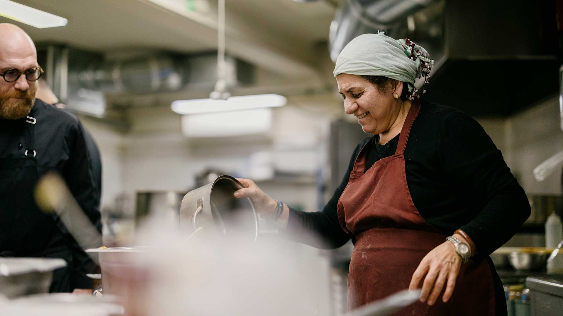 Στην καρδιά της Αθήνας, το Feyrouz, το γνωστό στέκι για λιβανέζικο street food, έχει μαγείρισσα τη Φεϊρούζ-Ελένη, μια γυναίκα που έχει φέρει κι έχει μάθει στο αθηναϊκό κοινό τις γεύσεις της πατρίδας της, της Αντιόχειας. Τα πεϊνιρλί, τα λαχματζούν, τα μαγειρευτά και τα γλυκά της είναι ονειρεμένα. Πλέον, στο μαγαζί της έχει να προσφέρει και κάτι παραπάνω: ένα τραπέζι που λειτουργεί σαν προέκταση του σπιτιού της. Στο transitional table, όπως το ονομάζουν, χωράνε μόλις δέκα άτομα. Η κράτηση γίνεται για τέσσερις και πάνω, καθότι είναι ιδανικό για μια παρέα ή μια οικογένεια που θέλει να ζήσει μια εμπειρία ανεπιτήδευτης φιλοξενίας. Αφήνεις το παλτό σου στην κρεμάστρα, παρατηρείς τα κλασικά σερβίτσια και το πρώτο ποτήρι κρασί φτάνει χωρίς να το ζητήσεις – όλα μέρος ενός μελετημένου food pairing. Το μενού είναι λιτό, αλλά μελετημένο. Ξεκινά με προζυμένιο ψωμί και αλοιφές: μουχαμάρα, χούμους, μουταμπάλ. Ο γιος της, Ανδρέας Κιλτσικσής, φροντίζει για τα ορεκτικά, ενώ η Φεϊρούζ-Ελένη ετοιμάζει ένα ζουμερό και αρωματικό μπεγιεντί, αλλά και ένα εξαιρετικό κομπάπ κόκορα με φρικέ – ένα σιτάρι με καπνιστή γεύση που δένει υπέροχα με τα ανατολίτικα μπαχαρικά. Το γεύμα κλείνει με γαλακτομπούρεκο φτιαγμένο με μυζήθρα Κρήτης. Μ.Π.