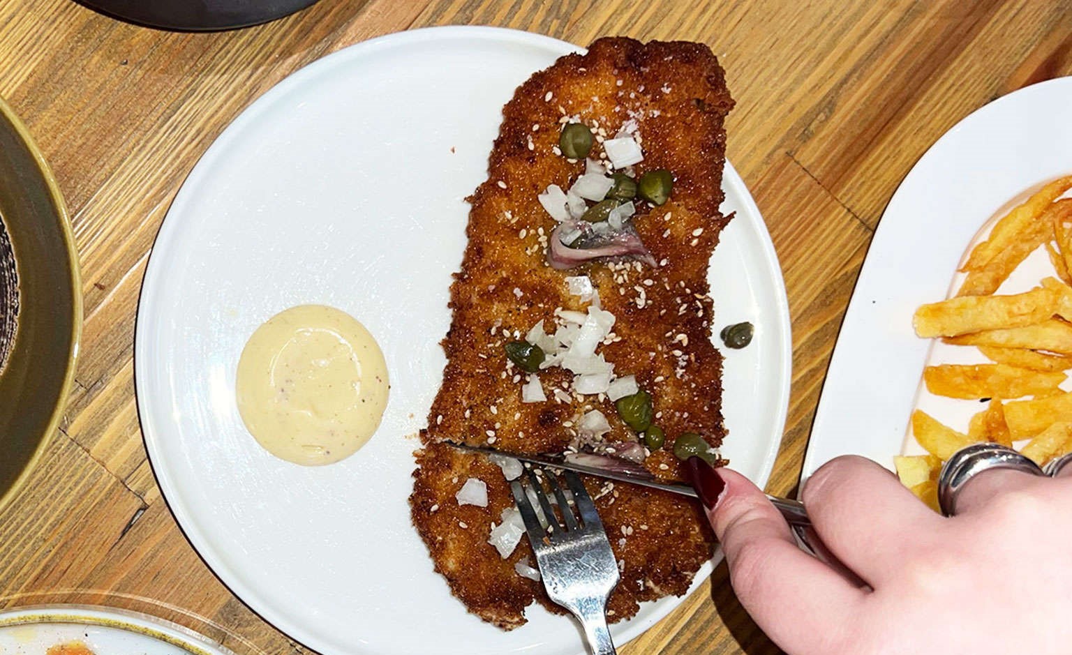Με τις ζουμερές σεφταλιές πάει πολύ το δροσερό ταμπουλέ με ταχινογιάουρτο και ωμή σάλτσα ντομάτας ενώ τα κανελόνια με ραγού κόκορα και μπεσαμέλ με αρσενικό Νάξου, παρόλο που δεν τα λες ακριβώς μεζέ, είναι και αυτά λιχούδικα. Έχει και άλλα πολλά το μενού: φρυγαδέλι, shepherd’s pie με αρνίσιο κιμά, αλμυρό ντόνατ με πούδρα από άγρια μανιτάρια, αρσενικό και καραμελωμένα φουντούκια, φουρνιστή φάβα με λουκάνικο Τζουμαγιάς… Έχει και ένα τραγανό χοιρινό σνίτσελ που με κέρδισε με τα συνοδευτικά του: αντζούγιες Καλλονής, κάππαρη και λίγο ψιλοκομμένο κρεμμύδι και μαραθόριζα.