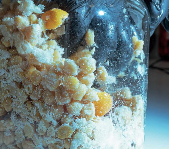 - Πασπαλίζουμε με αλάτι, ώστε να προστατεύσουμε το μείγμα από τυχόν μικρόβια. Το καλύπτουμε με μεμβράνη που να εφάπτεται στην επιφάνειά του και από πάνω τοποθετούμε ένα βάρος (π.χ. ένα βαρύ σκεύος), ώστε να μειώσουμε τον αέρα.