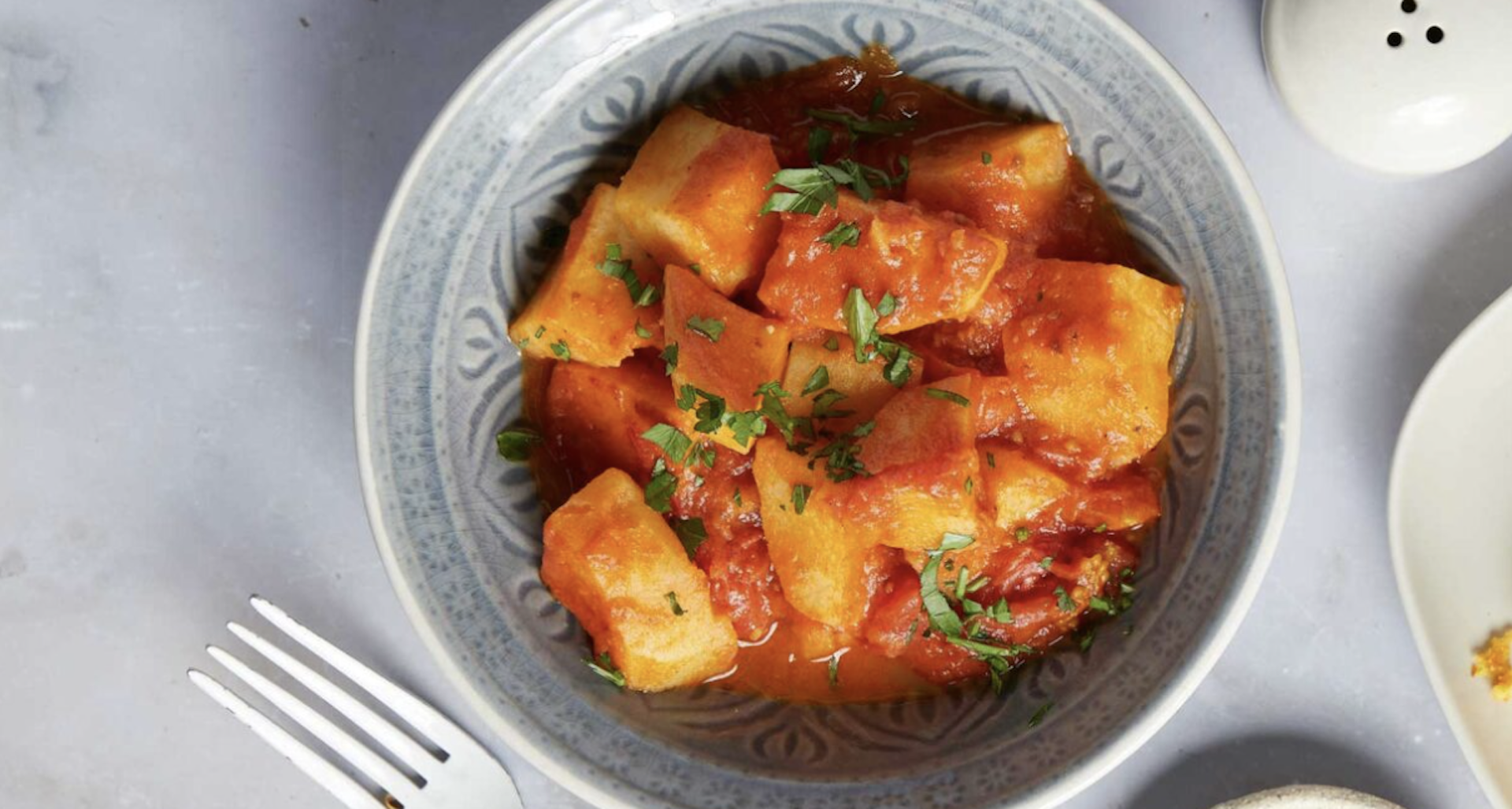 Με λίγο κόλιανδρο, τζίντζερ και κάρι οι κλασικές πατάτες γιαχνί μεταμορφώνονται. Συνοδεύουμε με ζεστό προζυμένιο ψωμί και χαλούμι σαγανάκι.