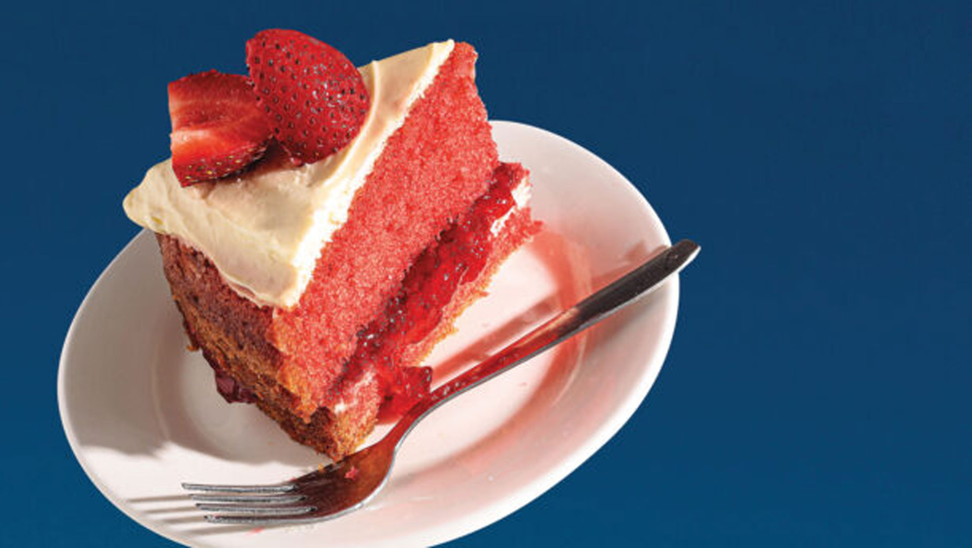 Εχουμε όμως και vegan λιχουδιά: ένα διαφορετικό red velvet με μαρμελάδα φράουλα ανάμεσα στις στρώσεις του κέικ και frosting φυτικού τυριού.
