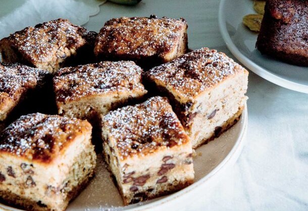 - Το αφήνουμε να κρυώσει εντελώς μέσα στο ταψάκι και το πασπαλίζουμε με άχνη. Το κόβουμε σε εννέα τετράγωνα κομμάτια και σερβίρουμε.