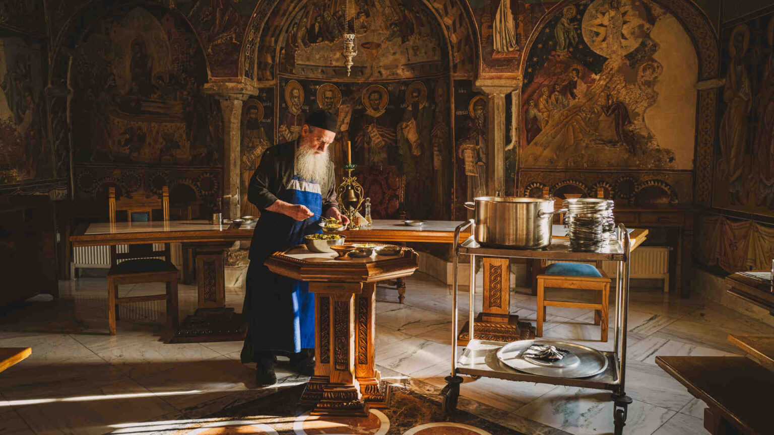 Η μαγειρική εδώ στο Άγιον Όρος έχει μια σχέση ιδιαίτερη με την παράδοση που συνεχίζεται μέχρι και σήμερα από τους πατέρες της μονής μας και της κάθε μονής. Και εμείς με τη σειρά μας την παραδίδουμε στους νεότερους, επισημαίνοντας το πόσο σημαντικό είναι να παραμένουμε σε αυτές τις αρχές. Η μαγειρική μας είναι αυτή της Ανατολικής Μεσογείου, η οποία είναι καλύτερη απ’ όλες τις μαγειρικές του κόσμου. Είναι πάντα σύγχρονη μαγειρική, γι’ αυτό ιδιαίτερα σήμερα είναι παγκοσμίως αναγνωρισμένη και το ζητούμενο κάθε γευσιγνώστη. Αυτή η μαγειρική κάνει το νερόβραστο φαγητό ένα νόστιμο αλάδωτο γεύμα, διότι άλλο το νερόβραστο και άλλο το αλάδωτο.