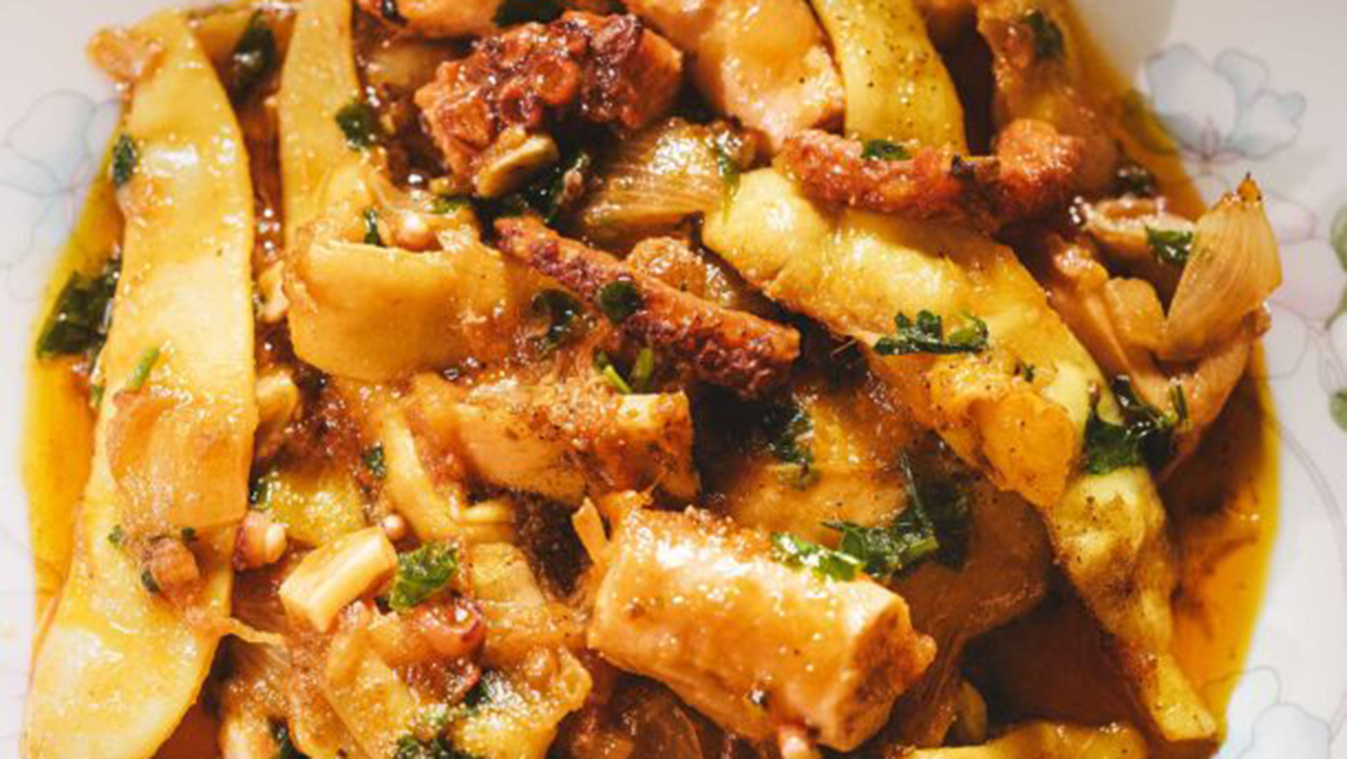 Με το ζουμί του χταποδιού που μένει από το άχνισμά του, μπορούμε να φτιάξουμε μια εξαίσια σάλτσα: προσθέτουμε λίγο κρασί και λάδι και το βάζουμε να βράσει μέχρι να μειωθεί πολύ και να γίνει σαν γλάσο. Σε αυτή τη σιροπένια σάλτσα μπορούμε να «διπλώσουμε» πατάτες βραστές. Γαρνίρουμε με φρέσκο κρεμμύδι και μαϊντανό – η πιο ωραία πατατοσαλάτα που θα έχετε φτιάξει ποτέ!