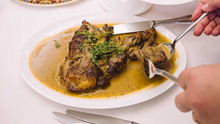 - Ρίχνουμε στο ζουμί που έμεινε στη γάστρα ή στο ταψί 200 ml καυτό νερό και τις δάφνες. Ανακατεύουμε και περιχύνουμε το κρέας στην πυρίμαχη πιατέλα.