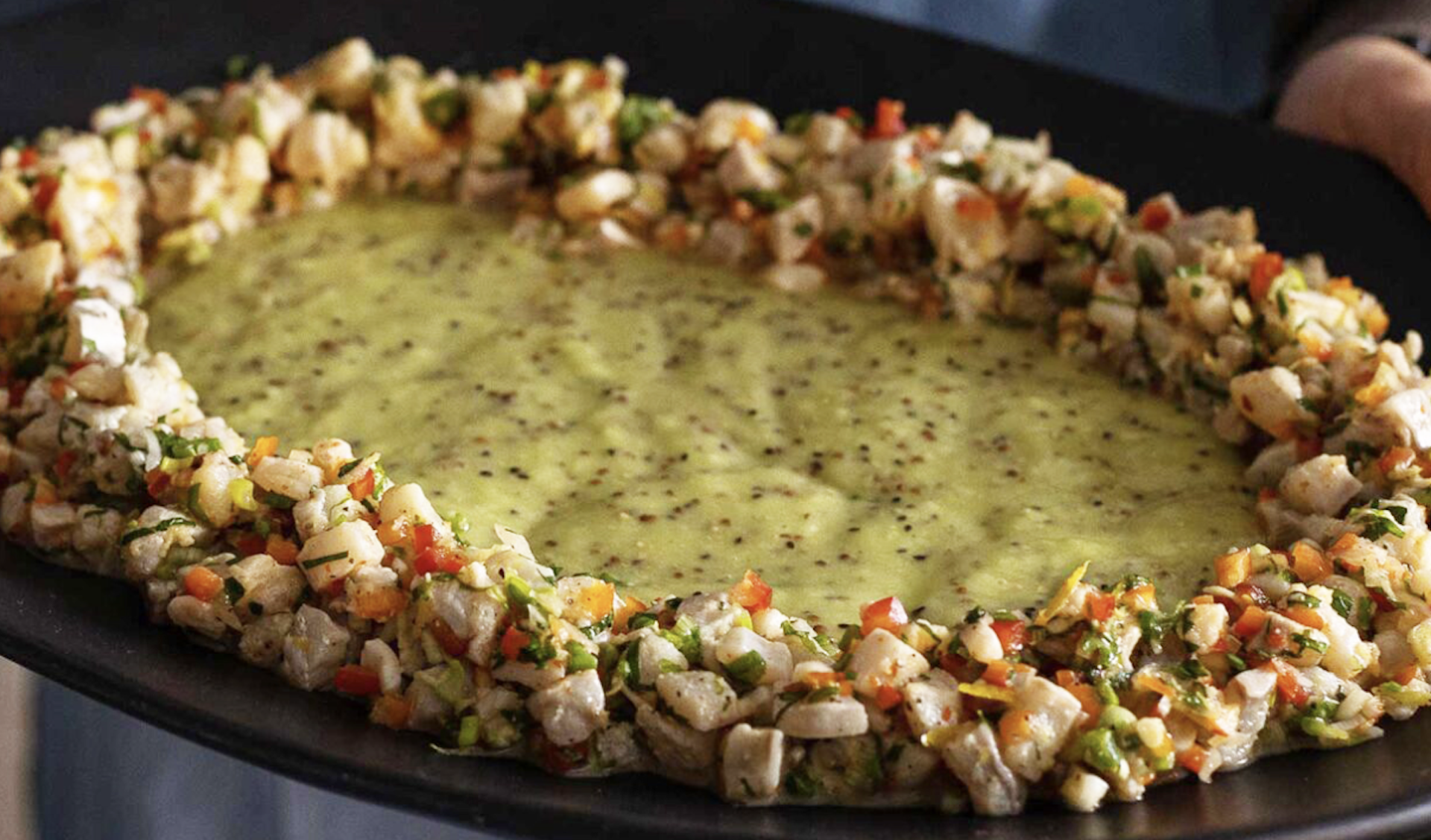 Δροσερός και πολύ αρωματικός μεζές, που απαιτεί ολόφρεσκο πελαγίσιο ψάρι. Το καλοκαίρι αντικαθιστούμε τα ακτινίδια με 2 μεγάλα, ζουμερά ροδάκινα.