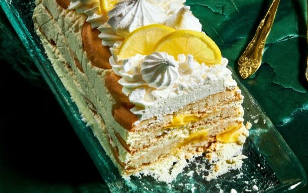 - Βγάζουμε τη φόρμα από το ψυγείο και στρώνουμε άλλες 3 εναλλάξ στρώσεις από μπισκότα και κρέμα, απλώνοντας επάνω σε κάθε στρώση κρέμας και 1-2 κουτ. σούπας λεμονόκρεμα. Την τελευταία στρώση κρέμας την αφήνουμε ως έχει. Θα περισσέψει μια ποσότητα κρέμας, την οποία αφήνουμε στο ψυγείο, σε μπολ σκεπασμένο με διάφανη μεμβράνη, γιατί θα τη χρειαστούμε αργότερα για τη διακόσμηση.
