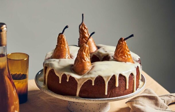- Περιχύνουμε την επιφάνεια του κέικ (όχι τα αχλάδια) με το γλάσο, αφήνοντας να τρέξει και στα πλαϊνά.
