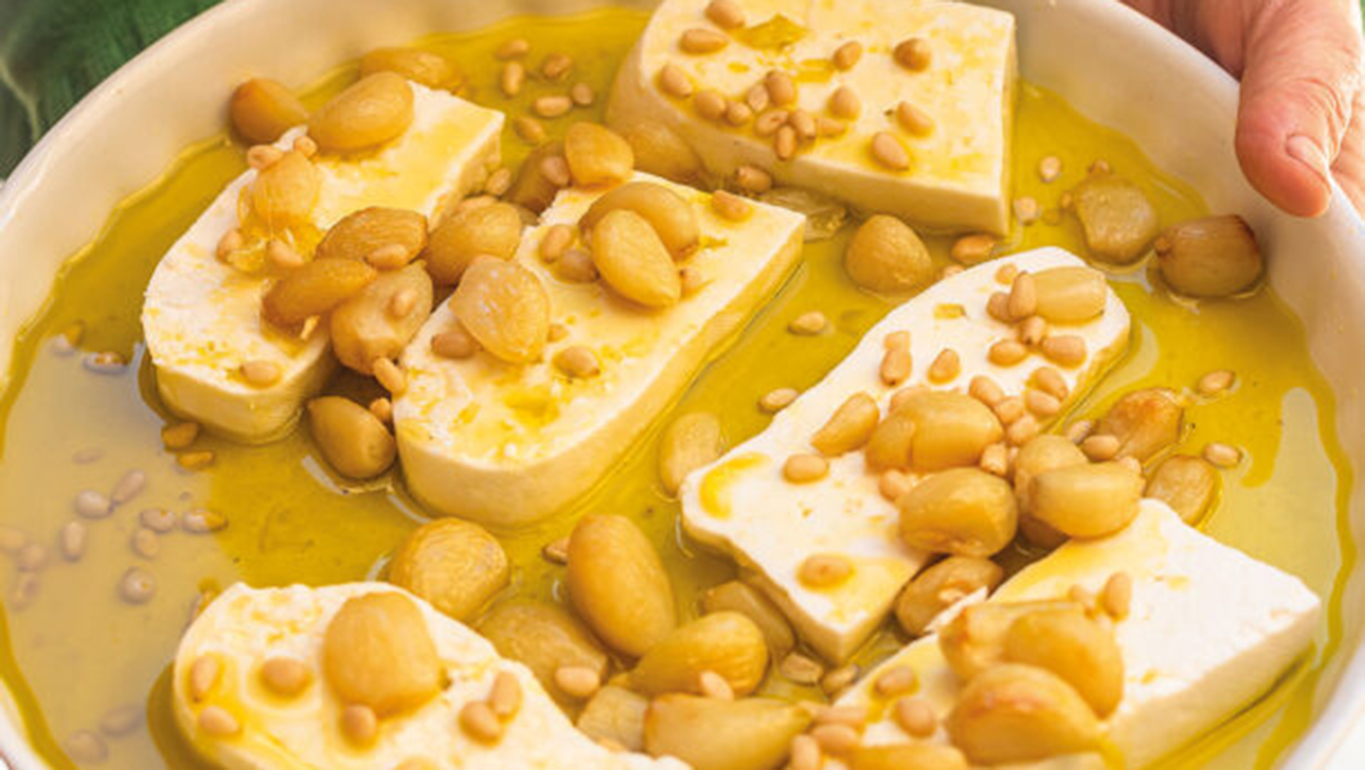 - Προσθέτουμε τα υπόλοιπα κουκουνάρια και το τυρί, σπασμένο σε κομμάτια και μοιρασμένο ανάμεσα στα σκόρδα.