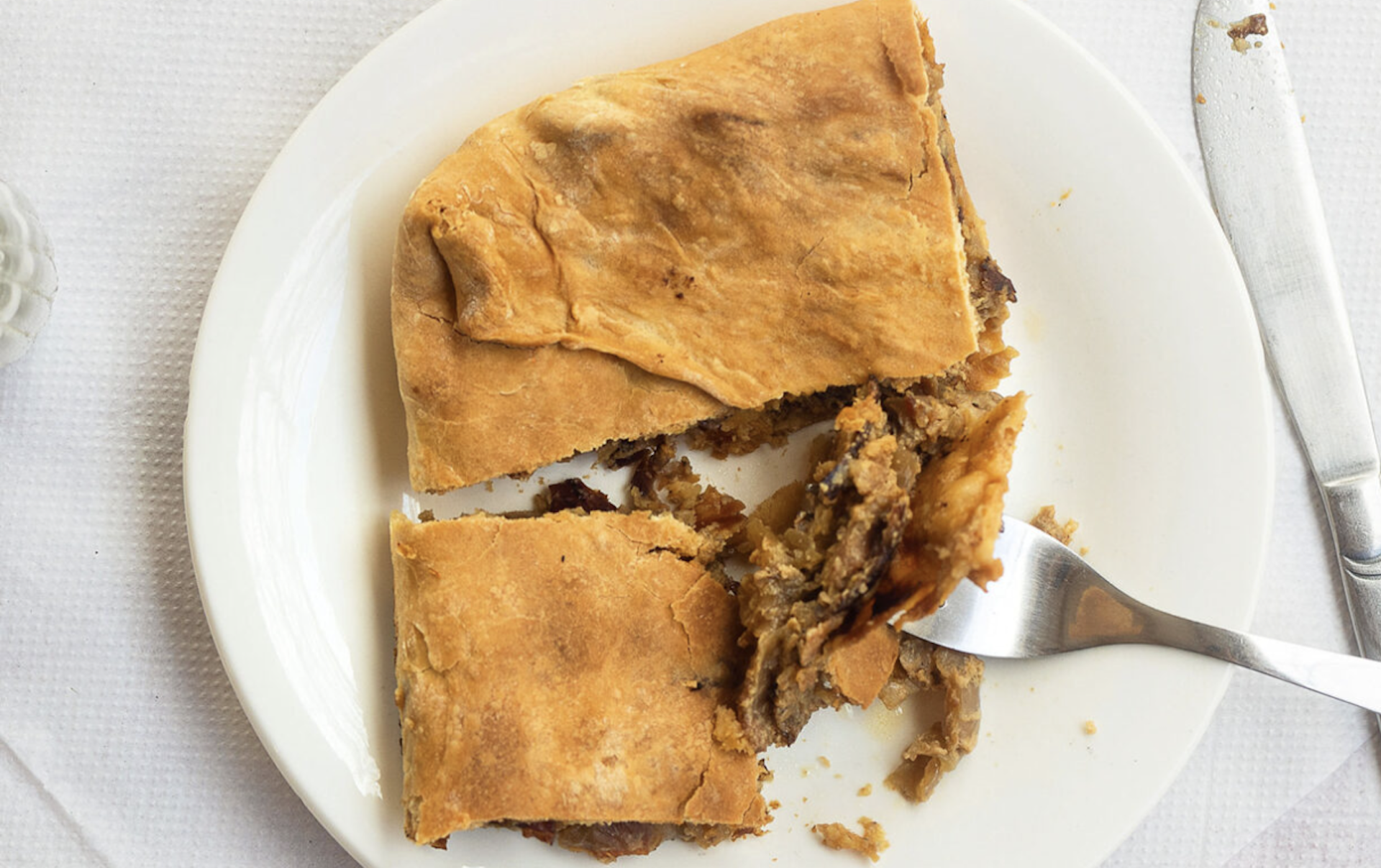 Θα είμαστε ειλικρινείς: Η αυθεντική συνταγή που σερβίρεται στο Οβελιστήριο ο Φόρος στην Στην Παλαιά Περίθεια της Κέρκυρας, που αξίζει να την επισκεφτείτε για την παράξενη ομορφιά της, το καθαρά ορεινό τοπίο και τα πεζοπορικά μονοπάτια στο βουνό, είναι ελαφρώς διαφορετική από αυτήν που δίνουμε εδώ. Είναι μία από τις παλιότερες σπεσιαλιτέ της ταβέρνας, δουλεμένη για καιρό, και ο Θωμάς Συριώτης τη φυλάσσει ως κόρην οφθαλμού. Μας έδωσε όμως ό,τι πιο κοντινό σε αυτήν και, πιστέψτε μας, είναι λουκούμι. Η γεύση της γέμισης γλυκίζει ελαφρά, χάρη στα σχεδόν καραμελωμένα κρεμμύδια, και με καλής ποιότητας βούτυρο και αυγά αποκτά ωραίο άρωμα. Φτιάχνεται με δύο χωριάτικα φύλλα, ένα πάνω ένα κάτω, αλλά ο Θωμάς λέει ότι μπορούμε να τα αντικαταστήσουμε με δύο φύλλα σφολιάτας.