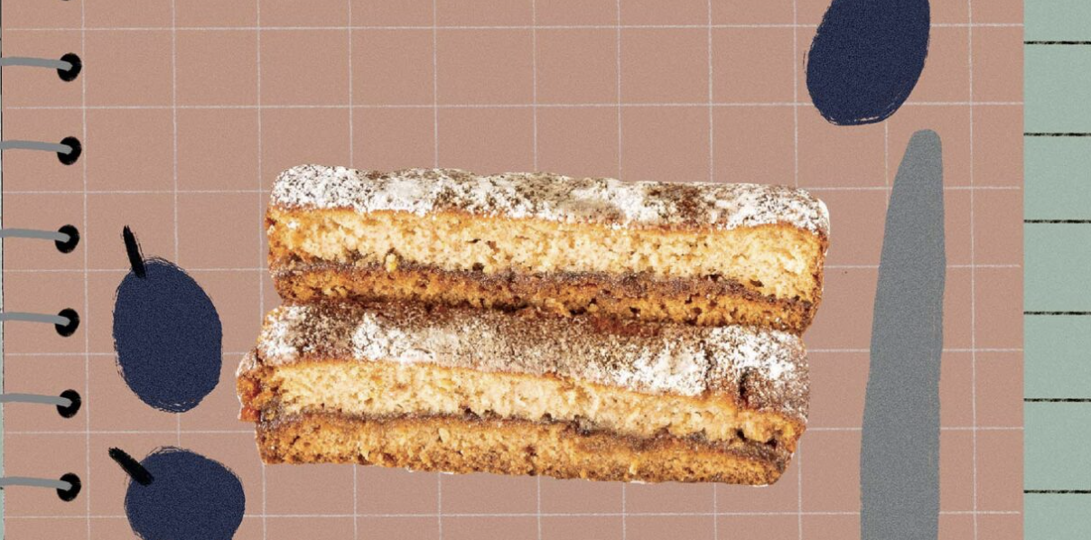 Ένα πολύ ωραίο κέικ, με μια στρώση μαρμελάδας δαμάσκηνο στη μέση κάθε κομματιού, που καλύπτεται με ζάχαρη άχνη – τέλεια παρέα για το τσάι ή τον καφέ.